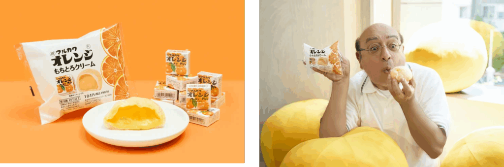 【マルカワオレンジもちとろクリーム】もちもちの生地に、やさしい甘さのオレンジクリームを閉じ込めた爽やかスイーツ。価格:198円(税込)